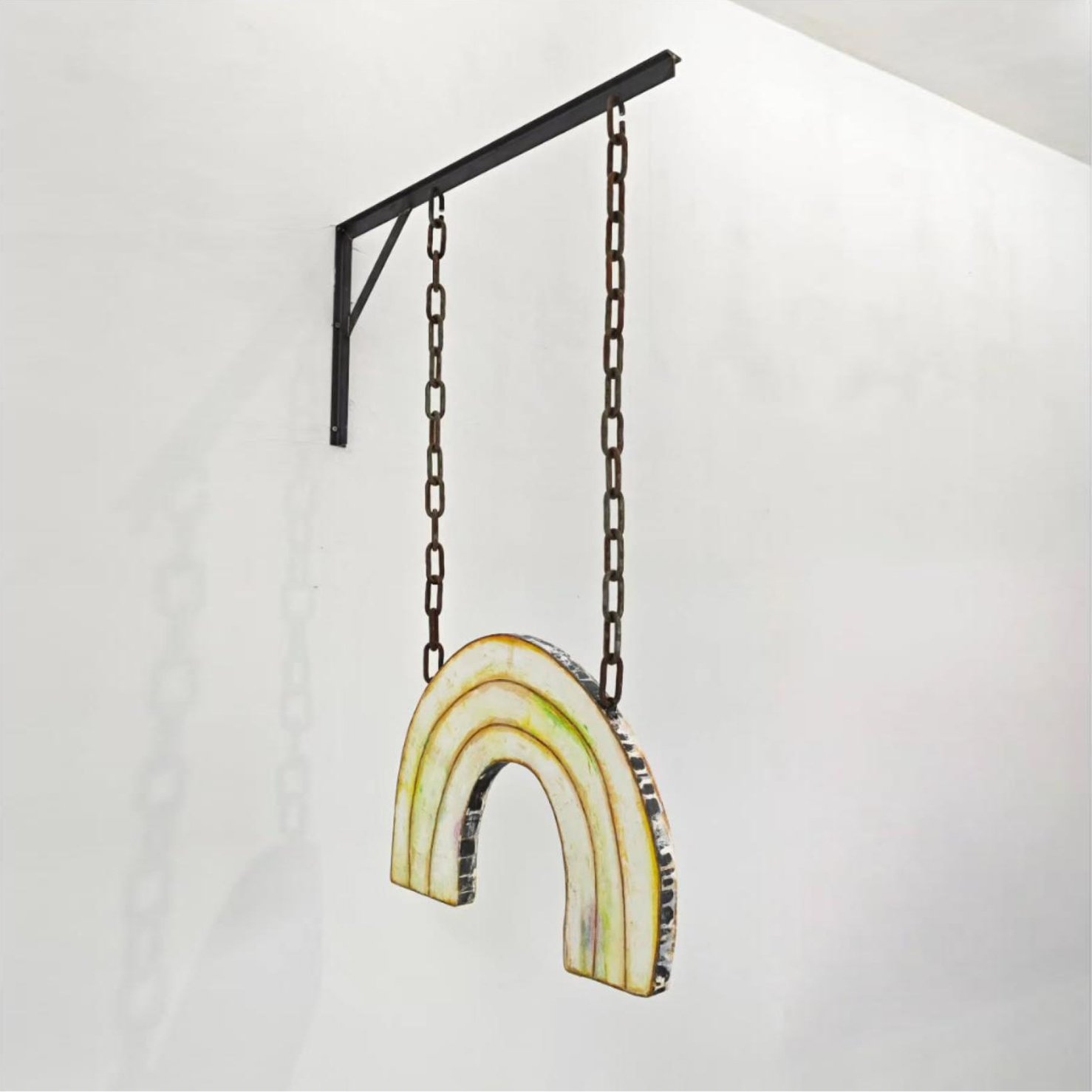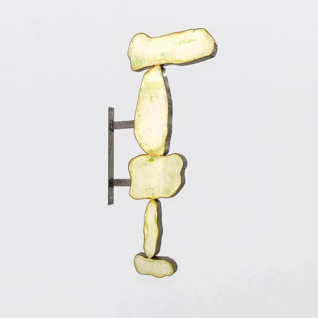 2021, 500x35x100cm, broken fence, aluminium, digital print on aluminium, burned soda can, rusted chain with shells, seed, wood, jesmonite and bubble gum with death flies
