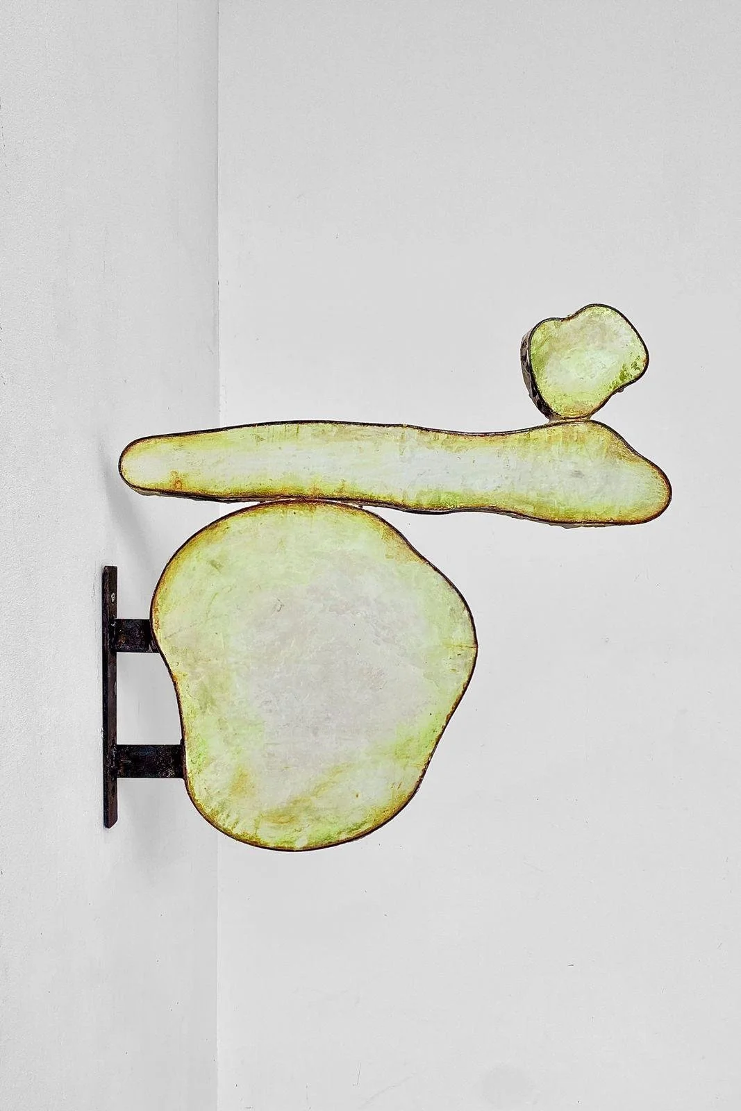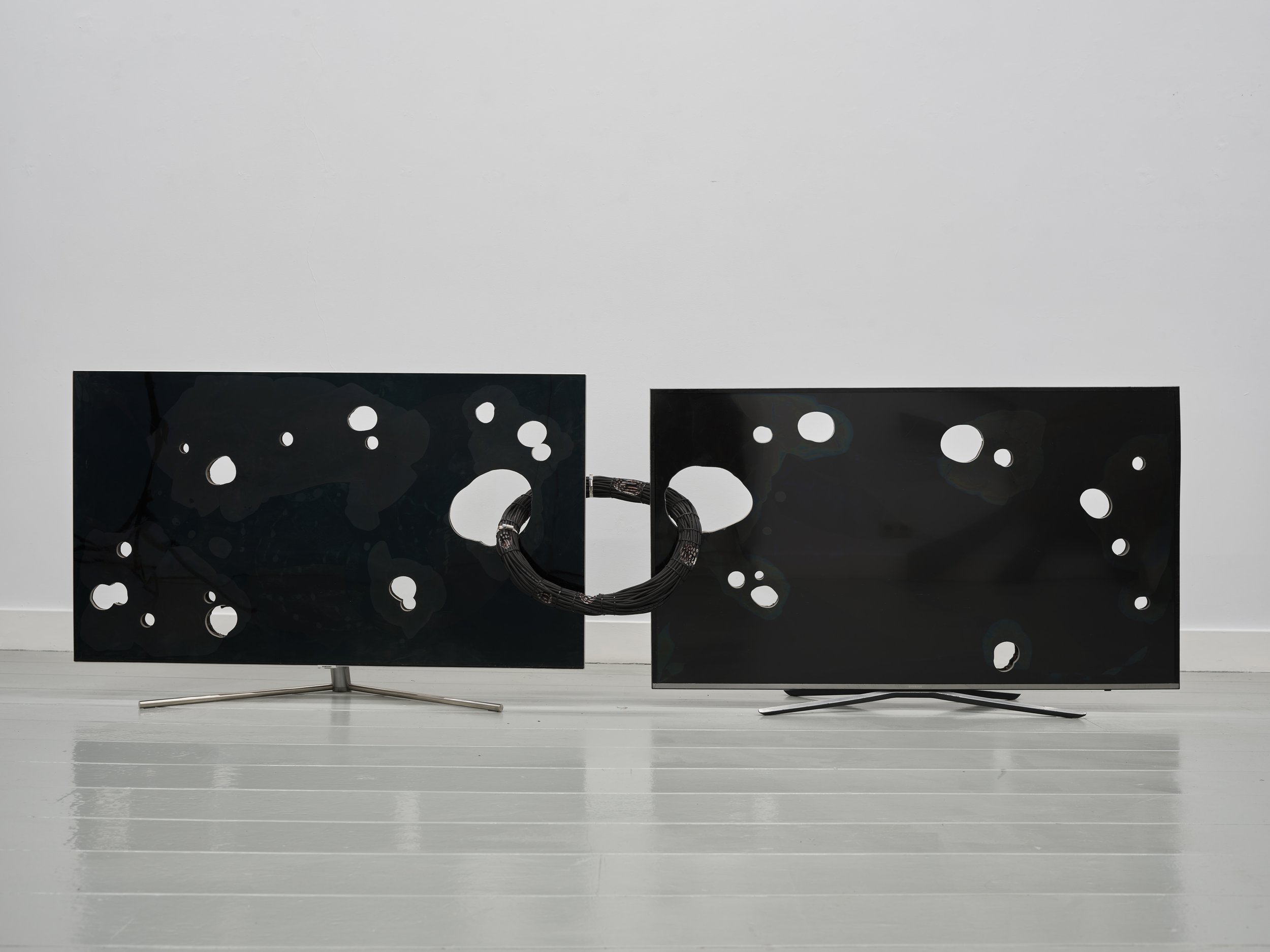 2023, dimensions variable, crashed car parts, copper pipes, gas, metal, wood, bronze, concrete, ceramic, weeds, pigeon feathers, robotic lights, jesmonite, screen bracket, lighter, beer cans, digital prints