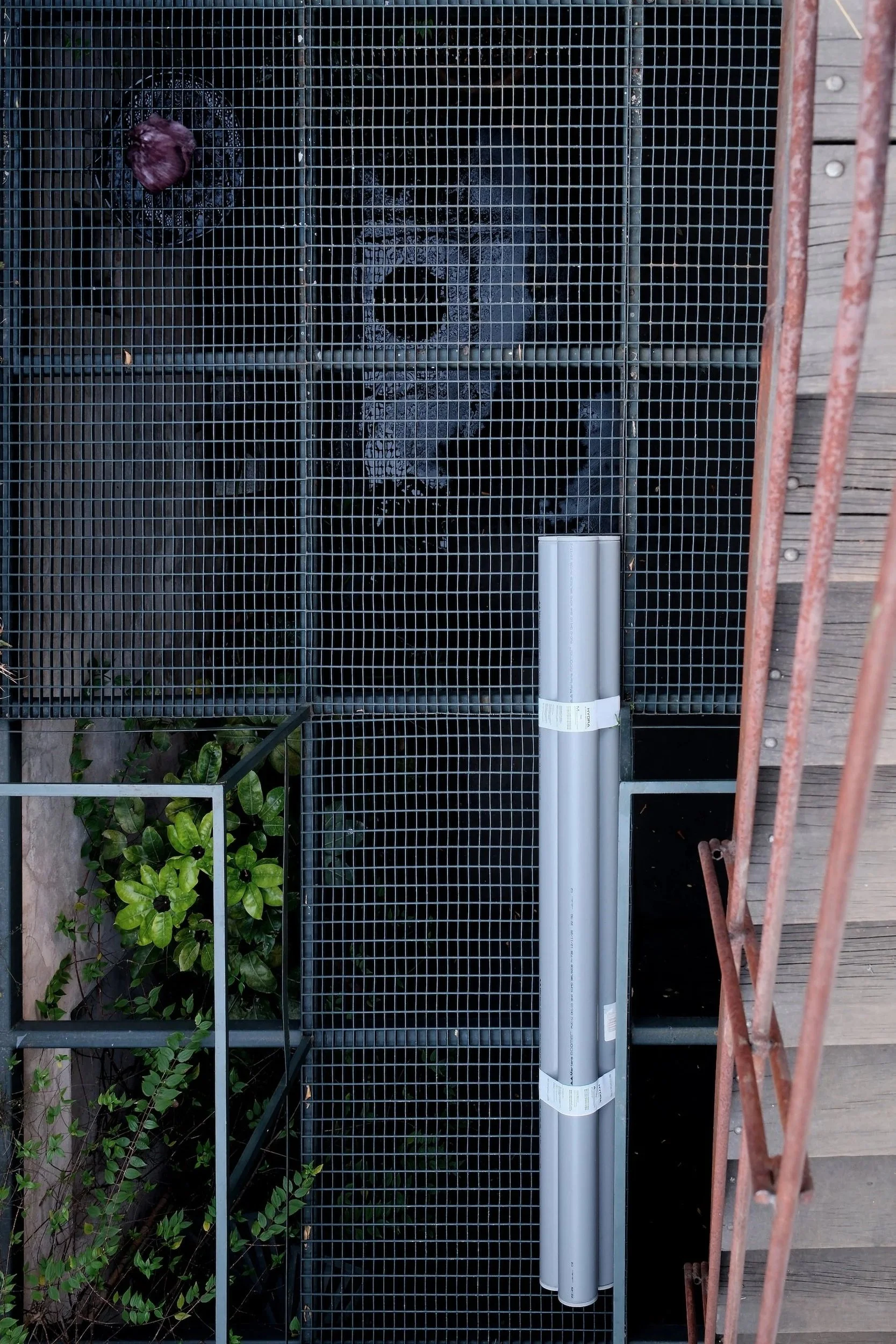 2021, 200x70x48cm stainless steel, bamboo, drill bit, wood, chain, rope, lock and digital print